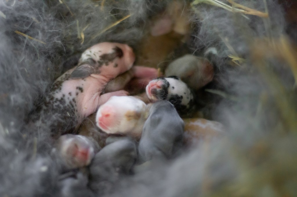 Allikevel er det viktig å sjekke at alle ungene har det bra med jevne mellomrom – og er ikke hunnen så fortrolig med at du styrer med redet, kan det være lurt å putte henne i et bur i mellomtiden. Jeg sjekker ungene kjapt når jeg ser at de har kommet til verden, og fjerner eventuelt døde unger, slik at de ikke ligger og råtner i haugen. Unger med defekter eller store skader blir også fjernet, men det er heldigvis sjeldent. Ungene fødes blinde, døve og pelsløse, men pelsen vokser fort.