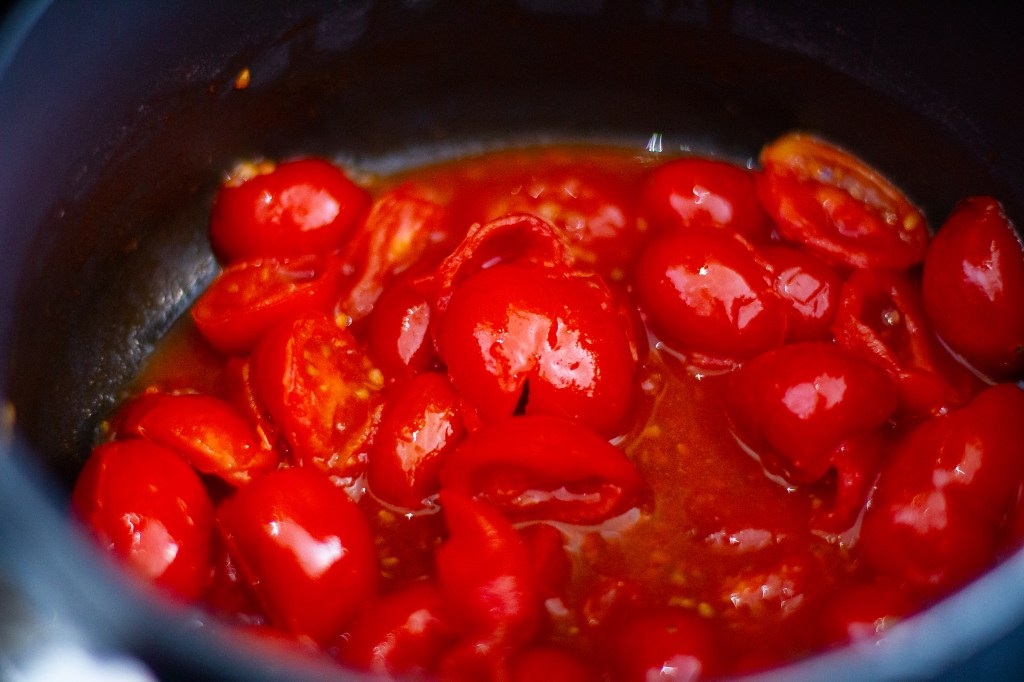Del tomatene i mindre biter og ha i en kasserolle. Hell over litt olivenolje som tomatene kan putre i på svak varme i 45-60 minutter. Rør om av og til.