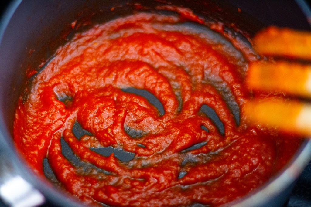 Bruk en stavmikser og mos opp tomatene. Bruk en sil og sil bort skall og frø, og fortsett kokeprosessen av massen til ønsket konsistens. Smak til med salt, pepper og litt sukker. Jeg synes også det er godt med enten litt tørket basilikum eller oregano i, men dette kan sløyfes.