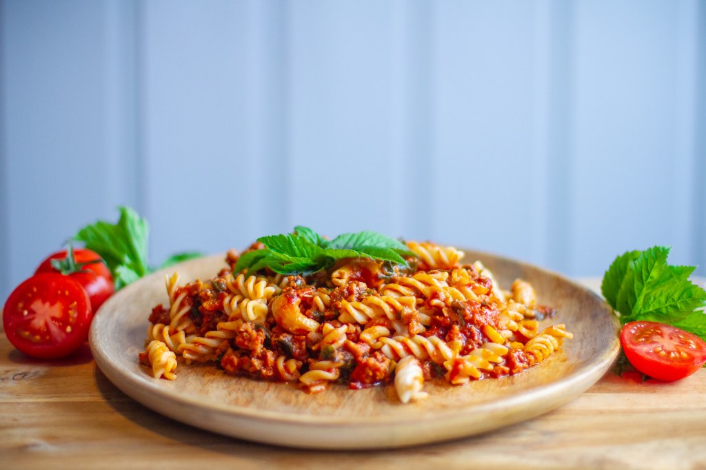 Mens pastaen koker har du olivenolje i stekepannen, og bruner kjøttdeigen på middels varme. Kutt tomatene i biter, og ha i tomatbitene, mais og cashewnøtter i pannen med kjøttdeigen. Krydre med salt og pepper.